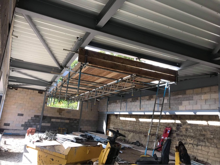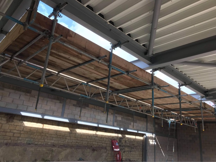 Scaffold erected above swimming pool to install Glass Atrium.