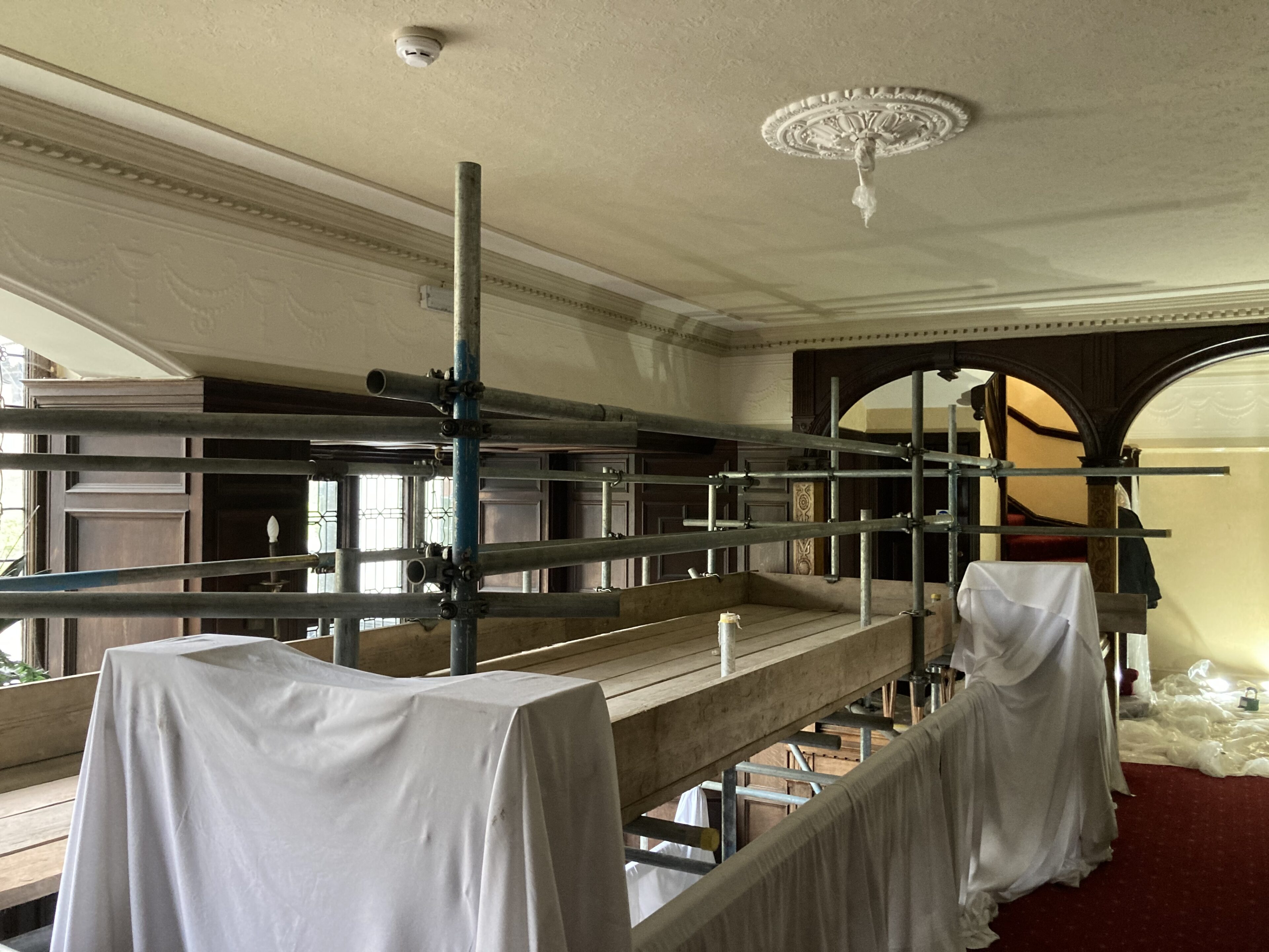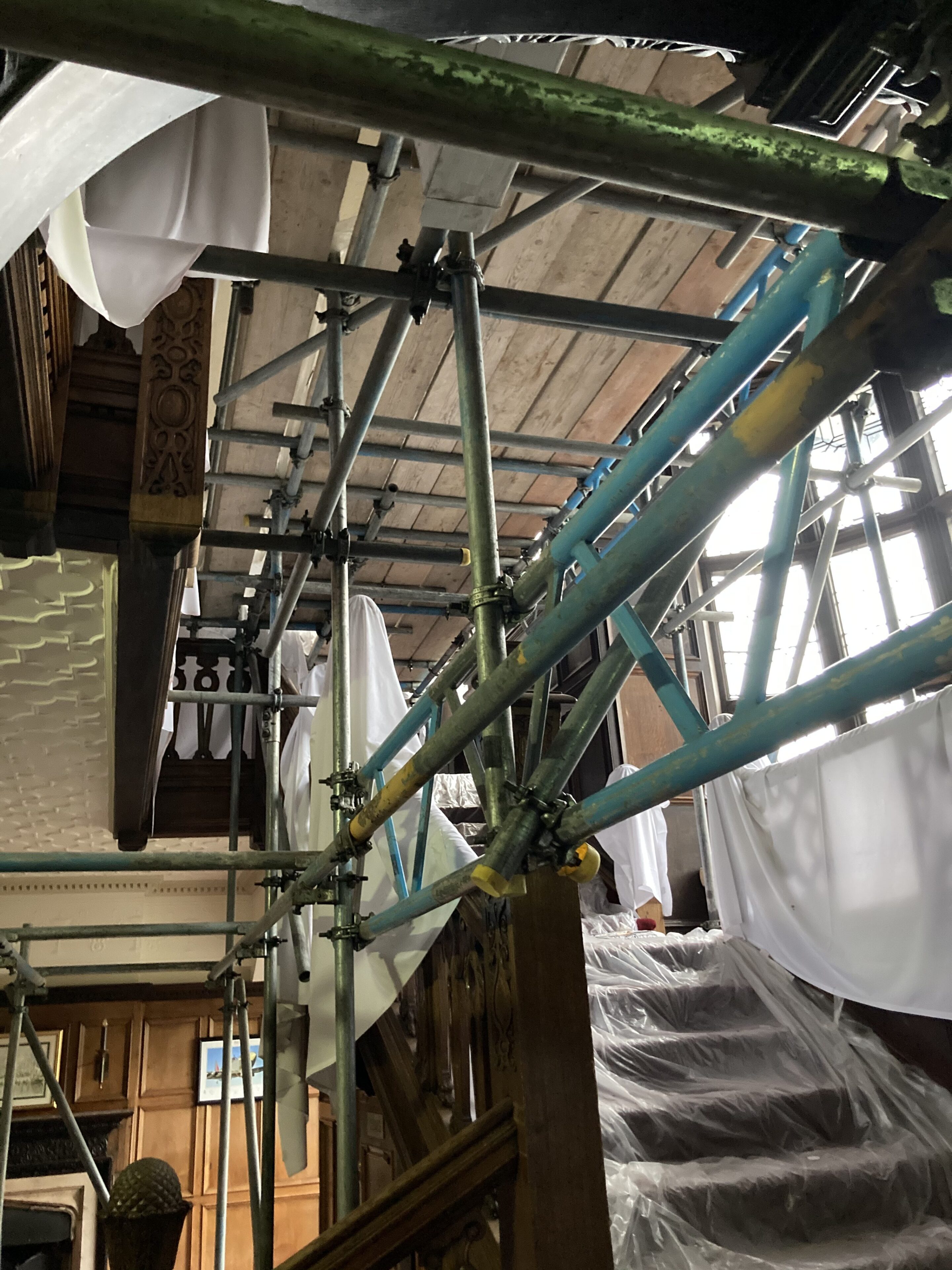 Scaffold above staircase for Plaster repairs.
